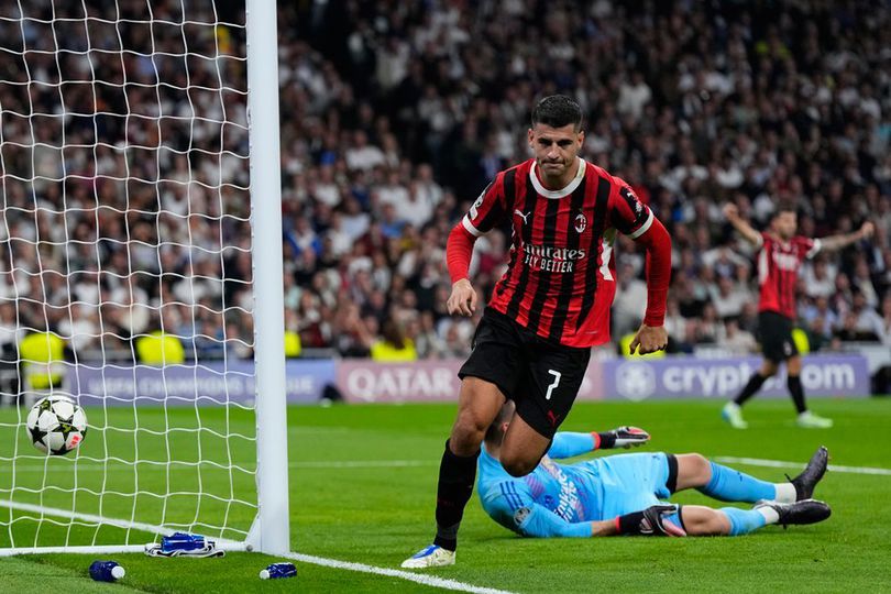 Selebrasi Alvaro Morata dalam laga Liga Champions antara Real Madrid vs AC Milan, Rabu (6/11/2024). (c) AP Photo/Manu Fernandez Viralterkini.id, Spanyol – AC Milan berhasil menumbangkan Real Madrid di Santiago Bernabeu dengan skor 3-1 dalam pertandingan ke-4 League Phase Liga Champions pada Rabu (6/11) dini hari WIB.