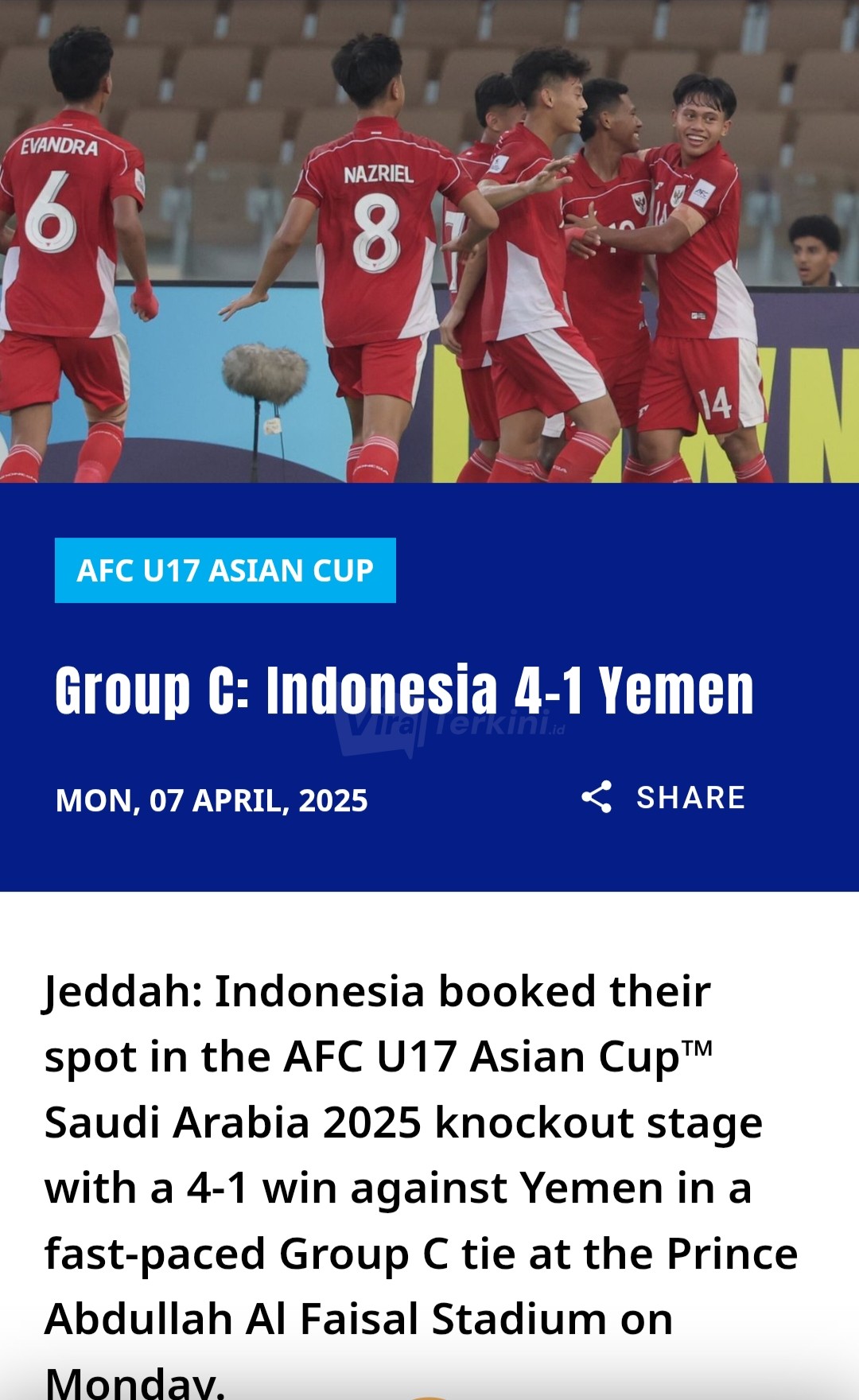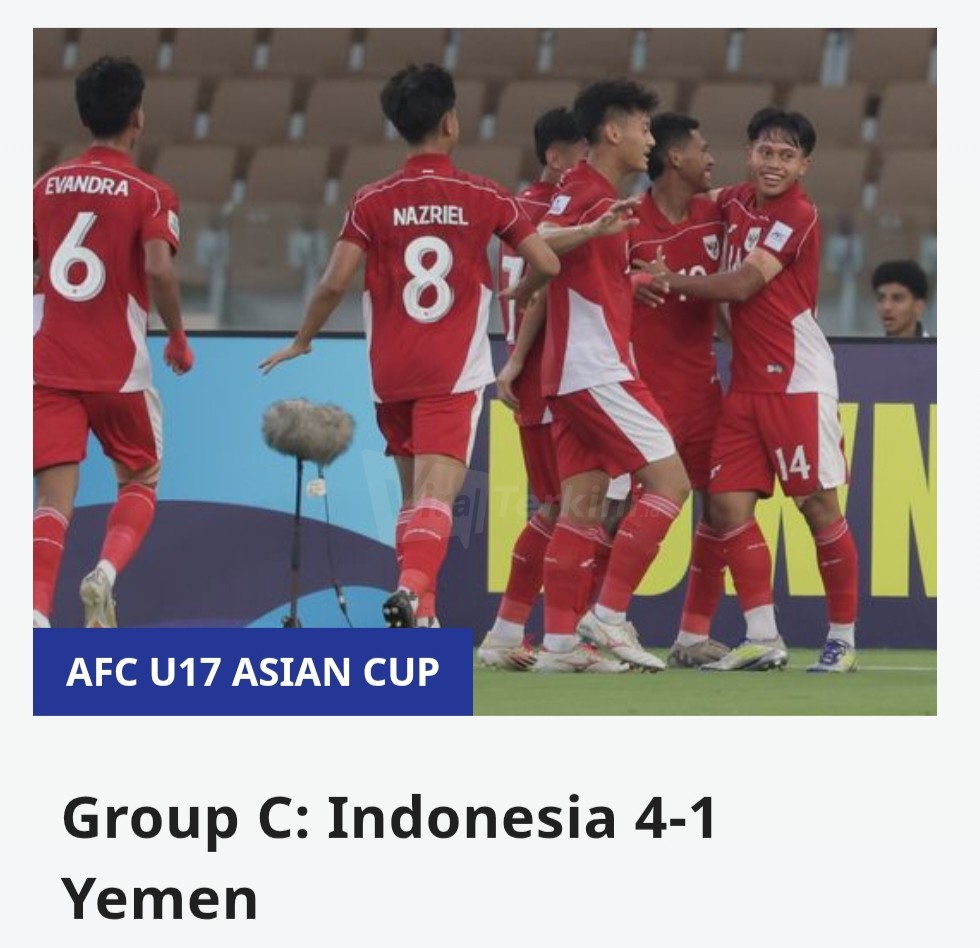 “Indonesia memastikan tempat mereka di babak sistem gugur Piala Asia AFC U-17 Arab Saudi 2025 dengan kemenangan 4-1 atas Yaman… yang berarti mereka juga akan berlaga di Piala Dunia U-17 FIFA Qatar 2025,” tulis AFC.
