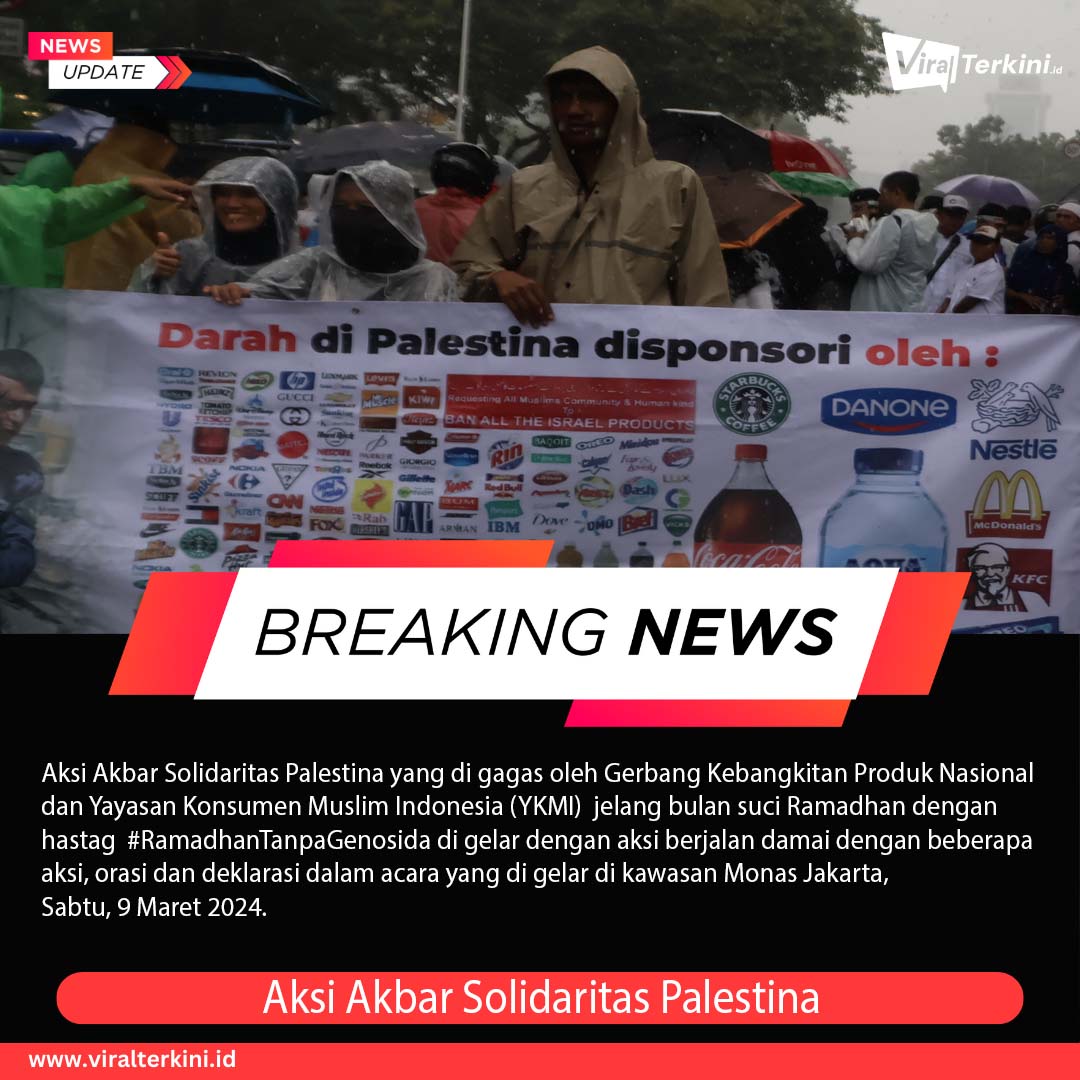 Viralterkini.id, Jakarta – Aksi Akbar Solidaritas Palestina yang di gagas oleh Gerbang Kebangkitan Produk Nasional (GERBANG PRONAS) dan Yayasan Konsumen Muslim Indonesia (YKMI) jelang bulan suci Ramadhan dengan hastag #RamadhanTanpaGenosida di gelar dengan aksi berjalan damai dengan beberapa aksi, orasi dan deklarasi dalam acara yang di gelar di kawasan Monas Jakarta, Sabtu, 9 Maret 2024.