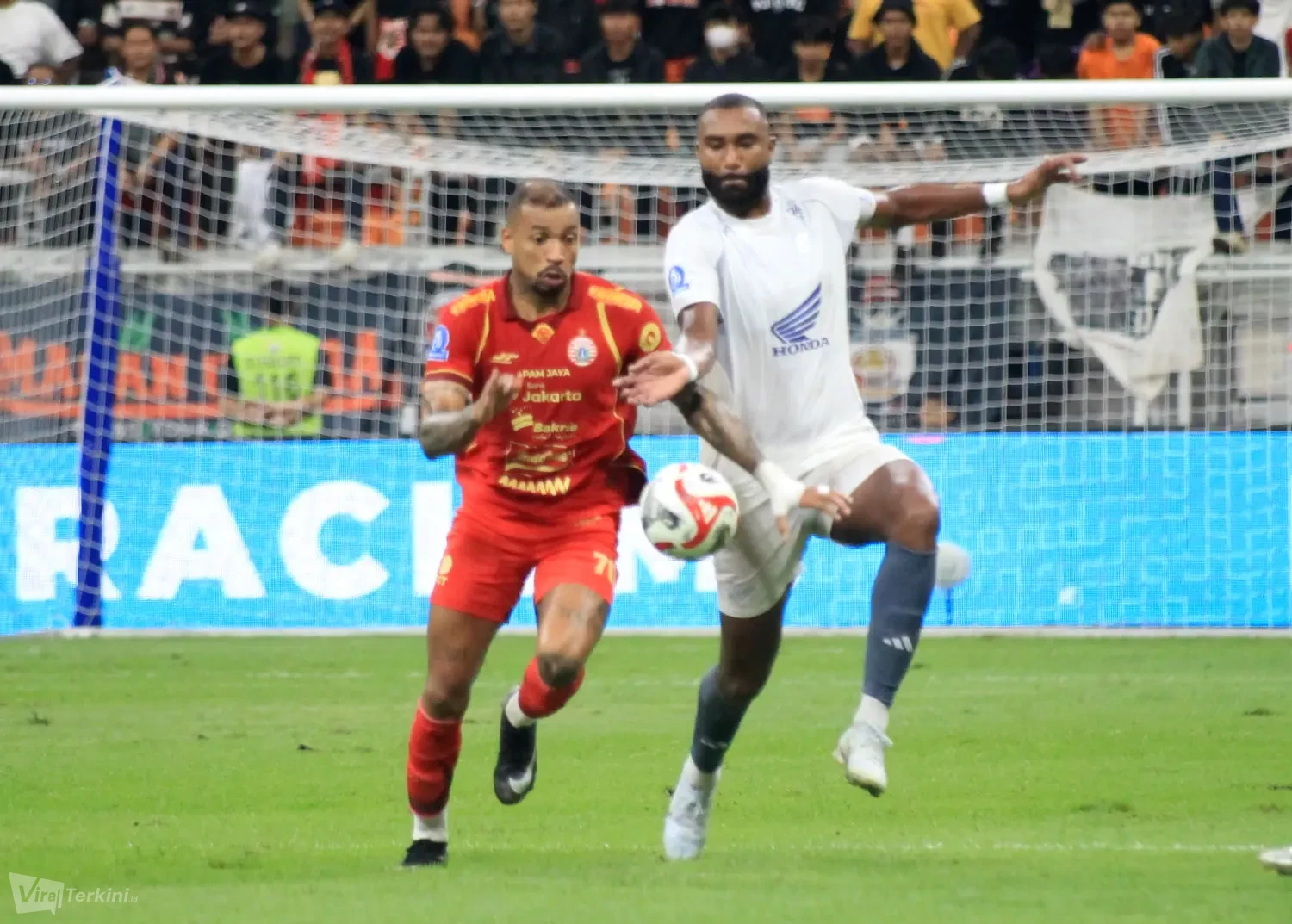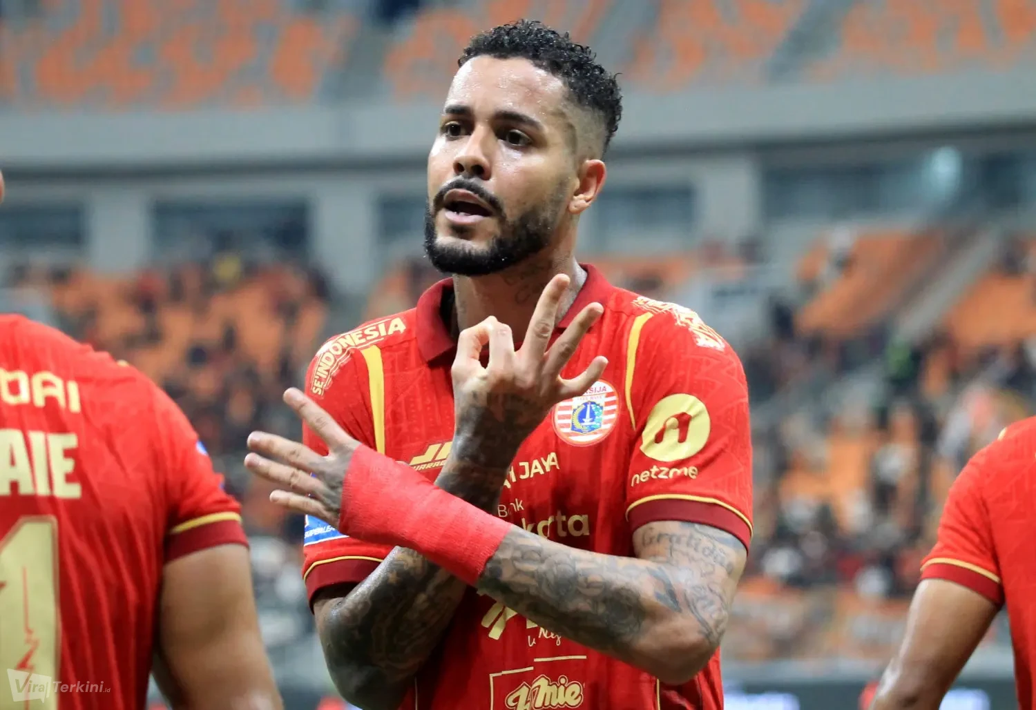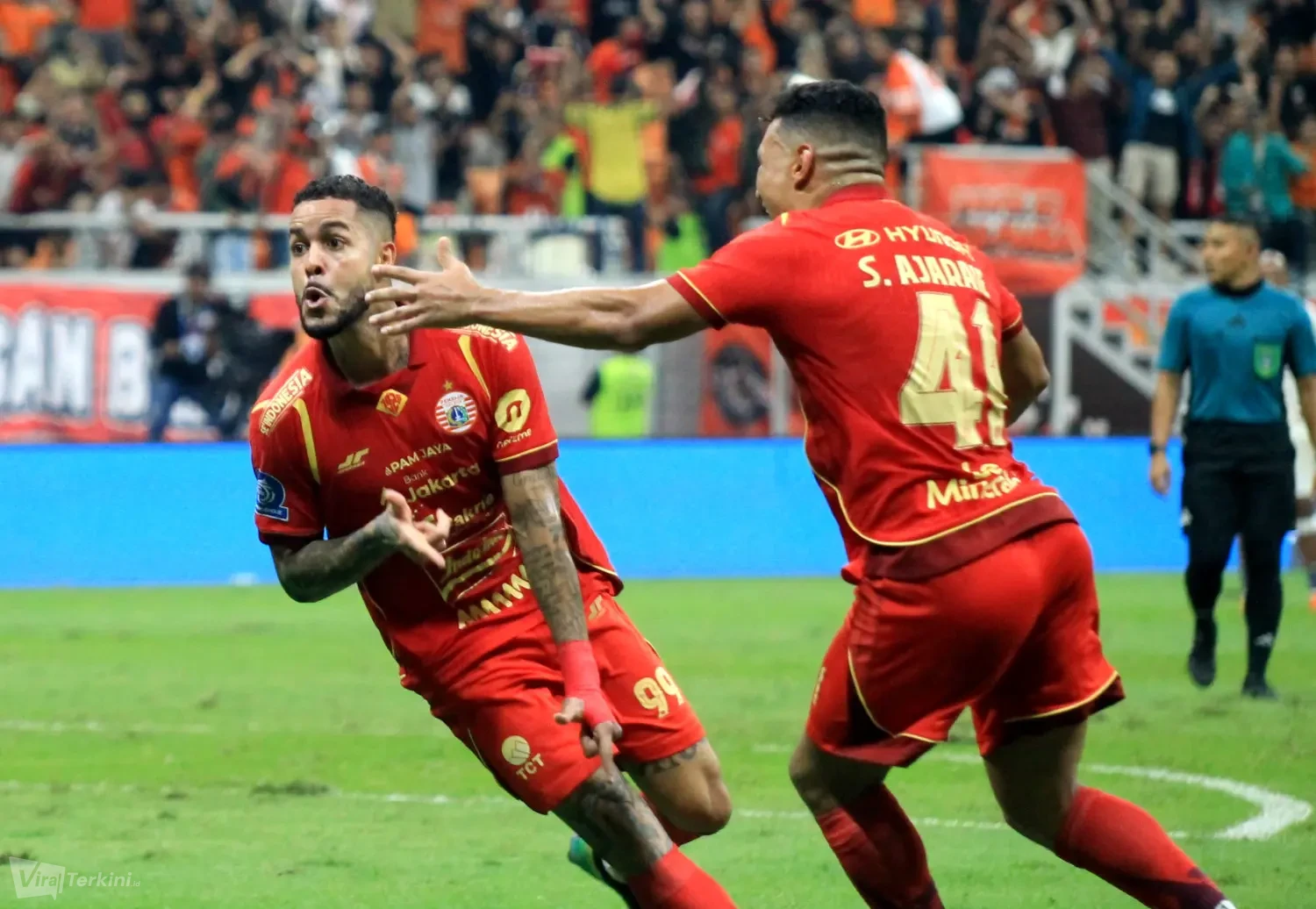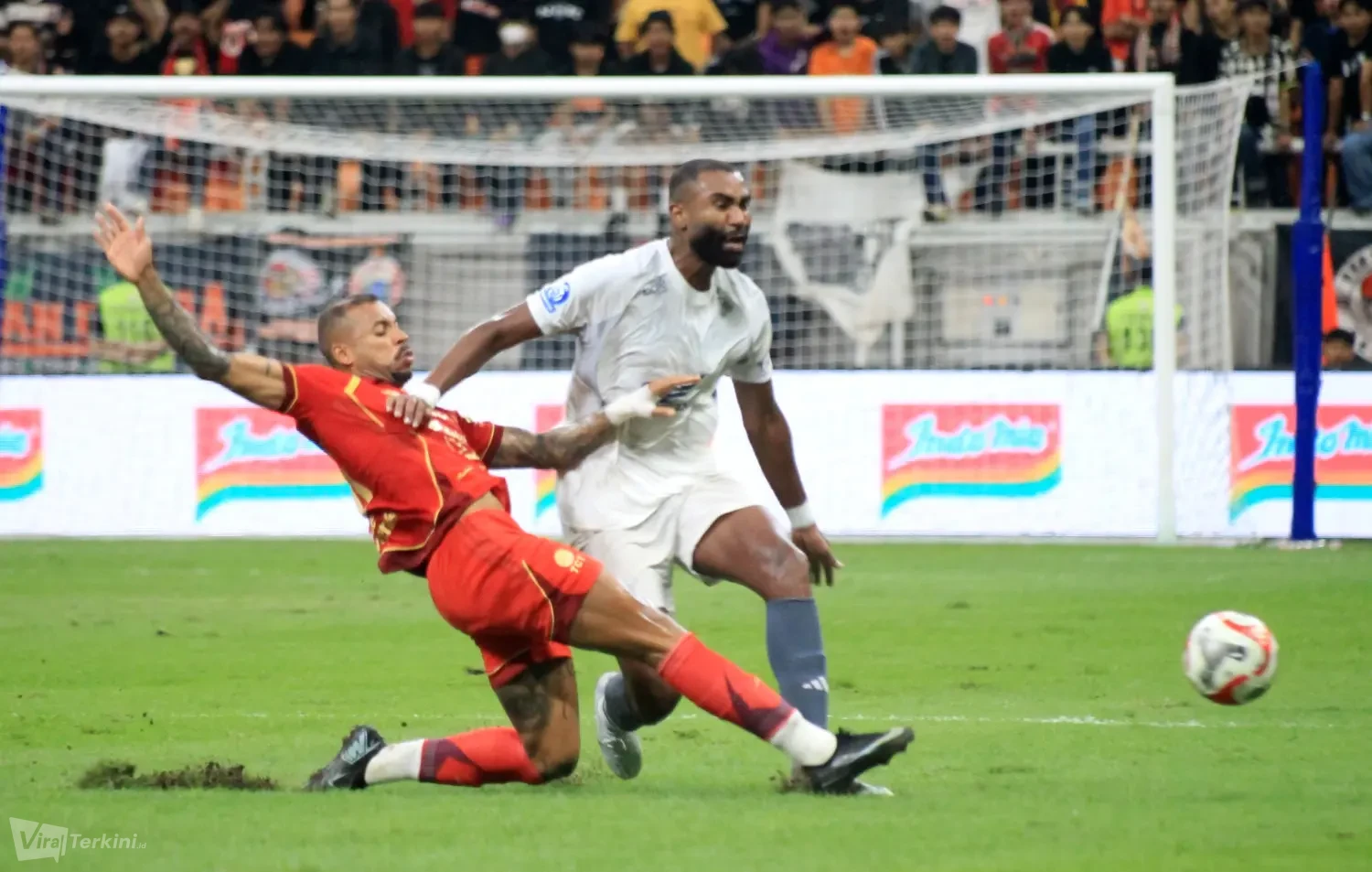 Selebrasi Pemain Persija, Emaxwell Souza De Lima pada menit 65 saat melawan PSM di Stadion JIS Jakarta, Jumat (20/02). Foto : Viralterkini.id/MAK Viralterkini.id, Jakarta – Akhirnya Macan Kemayoran memenangi pertandingan pada lanjutan pekan ke-22 BRI Super League dengan skor tipis 2-1 di Stadion JIS Jakarta, Jumat (20/02).