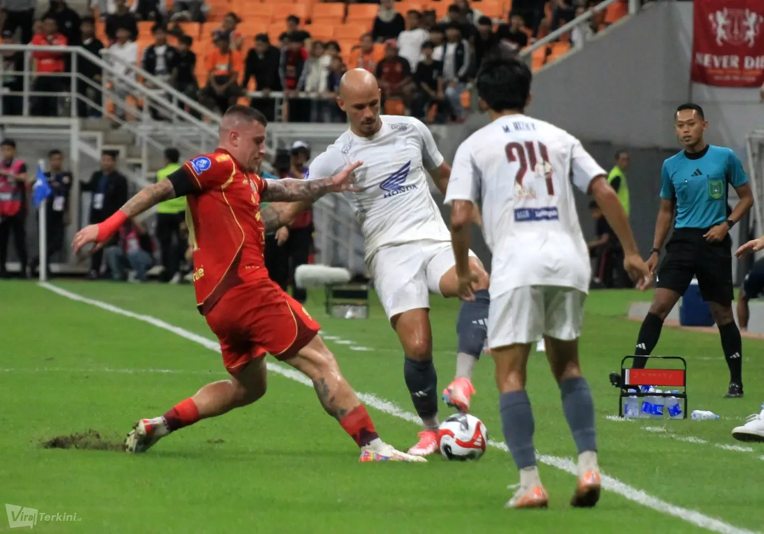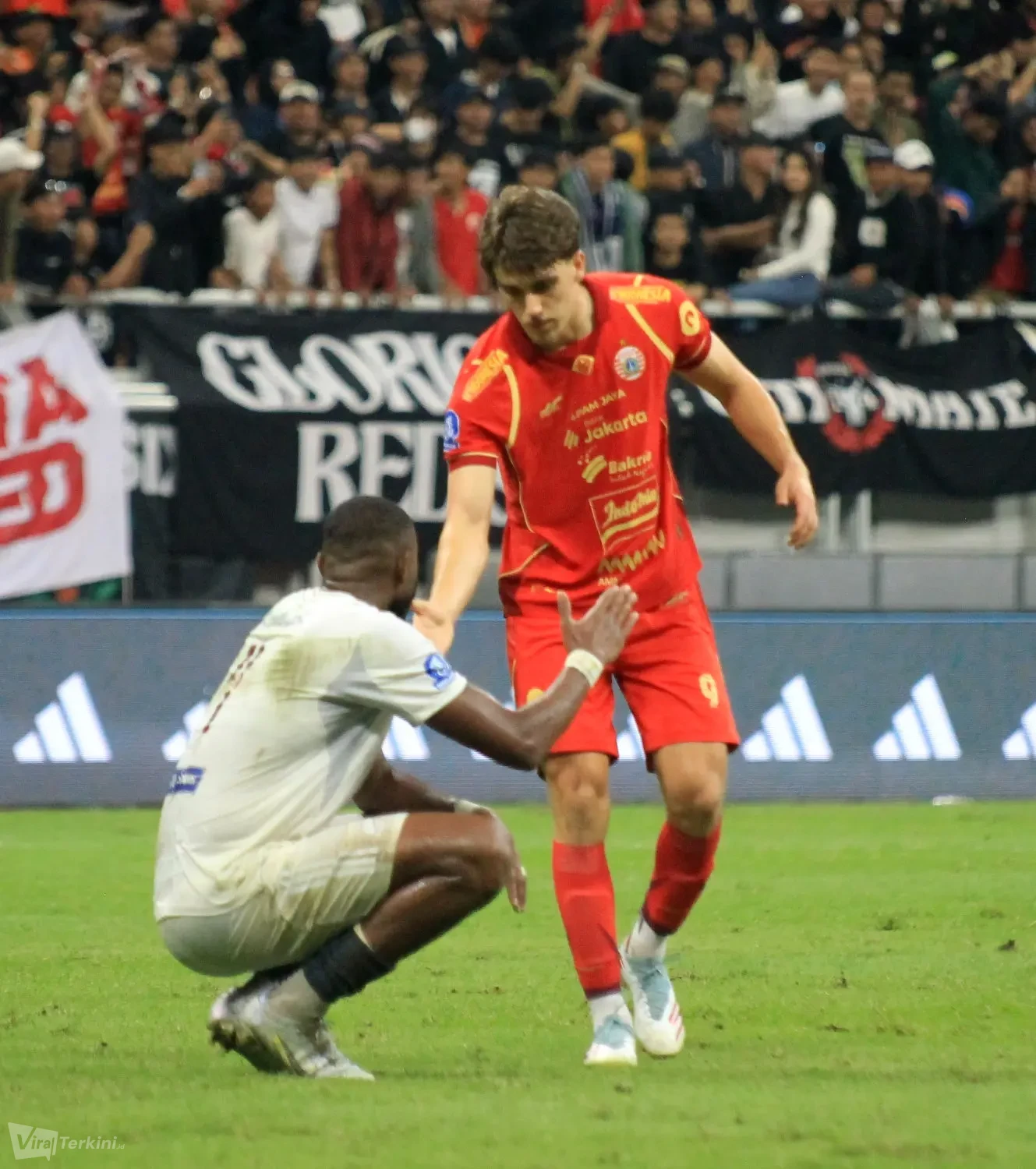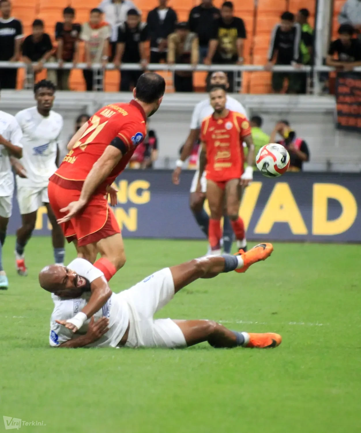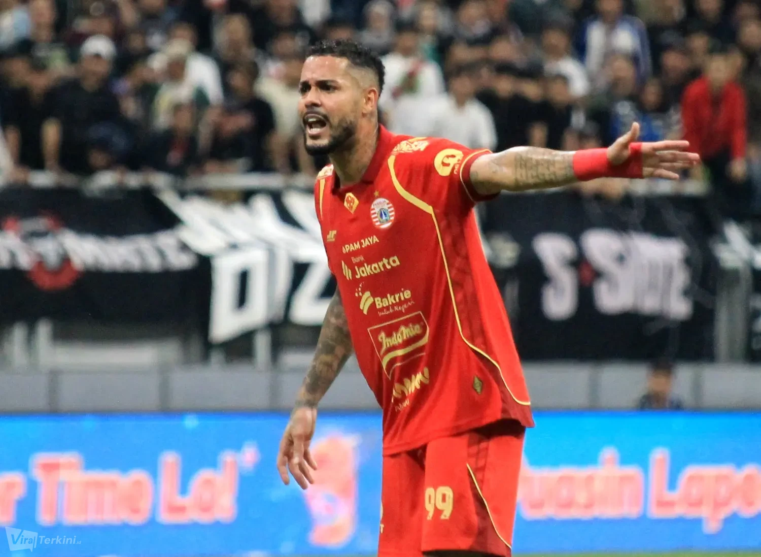 Selebrasi Pemain Persija, Emaxwell Souza De Lima pada menit 65 saat melawan PSM di Stadion JIS Jakarta, Jumat (20/02). Foto : Viralterkini.id/MAK Viralterkini.id, Jakarta – Akhirnya Macan Kemayoran memenangi pertandingan pada lanjutan pekan ke-22 BRI Super League dengan skor tipis 2-1 di Stadion JIS Jakarta, Jumat (20/02).