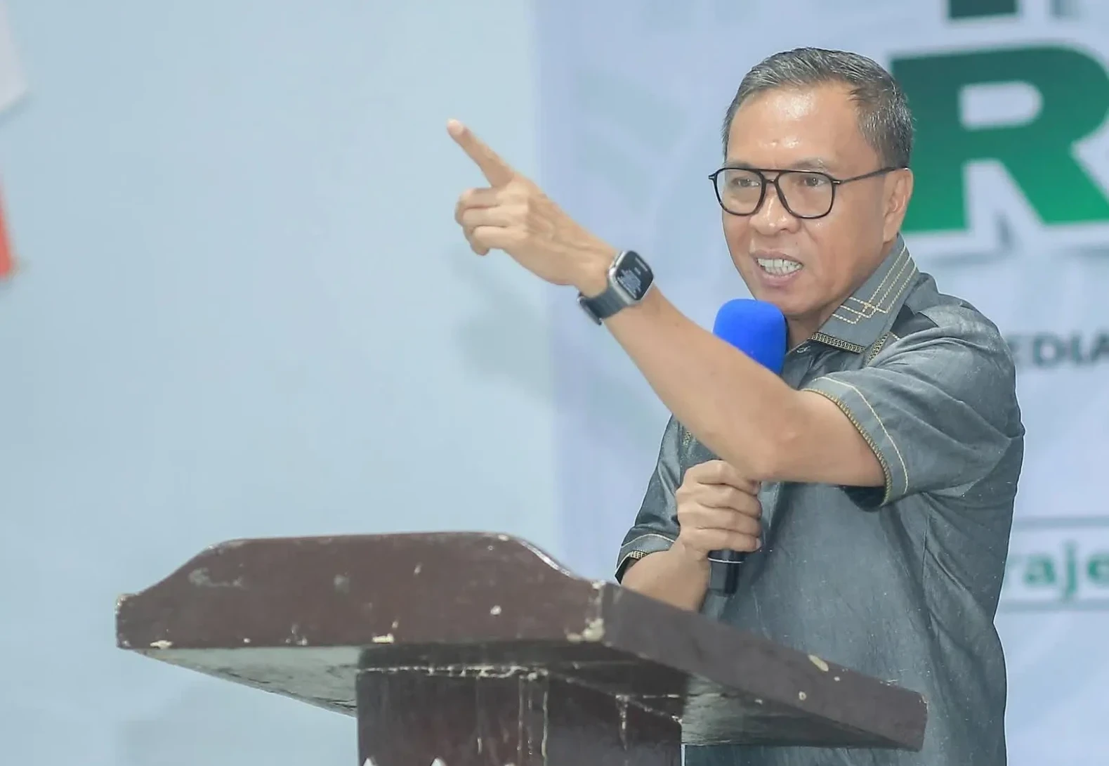 Ikram M. Sangadji, Bupati Halmahera Tengah, memberikan sambutan dalam Intermediate Training (LK II) Tingkat Nasional HMI Cabang Ternate Tahun 2026. Foto: Supriansah Nurdin