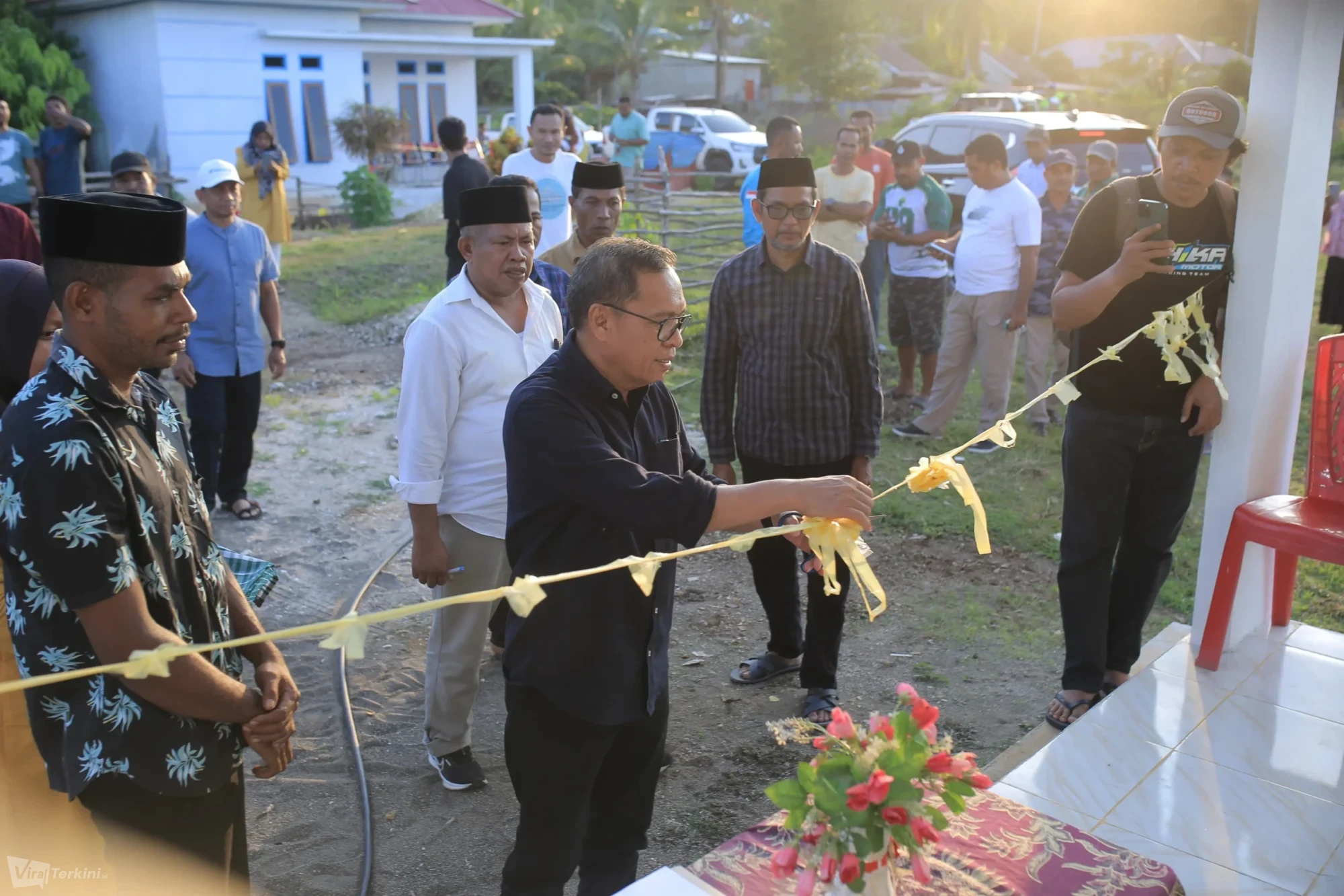 Bupati Halteng, Dr. Ir. Ikram Malan Sangadji, M.Si. (tengah), didampingi Kepala Dinas PMD Mustami Jamal, secara simbolis memotong pita pada prosesi peresmian 2 unit RLH di Desa Persiapan Santosa, Kecamatan Patani Utara, Selasa (24/3/2026). Foto: Supriansah Nurdin