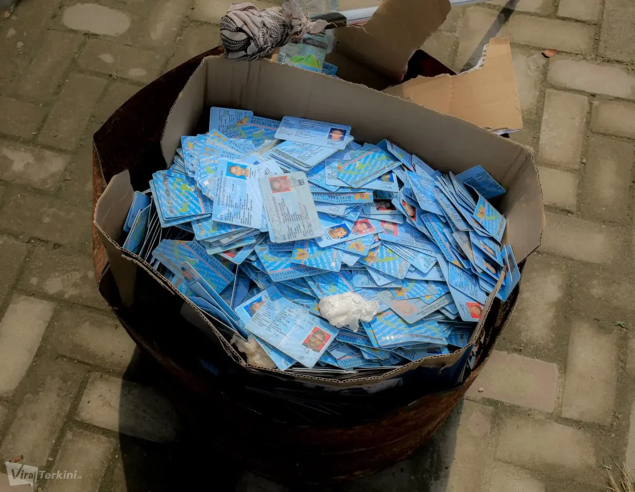 Bupati Halmahera Tengah, Ikram Malan Sangadji, menyaksikan langsung proses pemusnahan ribuan keping KTP-el dan KIA yang rusak atau invalid dengan cara dibakar di halaman kantor Disdukcapil Halmahera Tengah, Rabu (11/2/2026). Foto: Supriansah Nurdin Viralterkini.id, WEDA – Bupati Halmahera Tengah, Ikram Malan Sangadji, memimpin langsung proses pemusnahan ribuan keping Kartu Tanda Penduduk Elektronik (KTP-el) dan Kartu Identitas Anak (KIA) rusak di kantor Disdukcapil, Rabu (11/2).