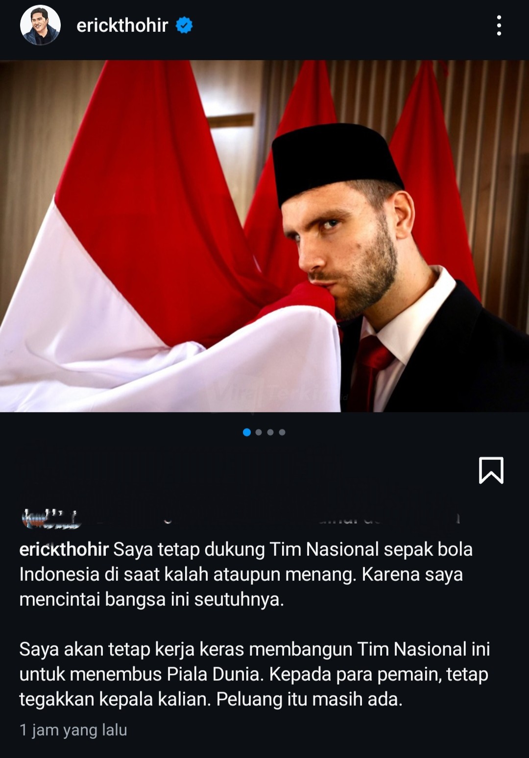 “Saya tetap dukung Tim Nasional sepak bola Indonesia di saat kalah ataupun menang, karena saya mencintai bangsa ini seutuhnya,” tulis Erick.