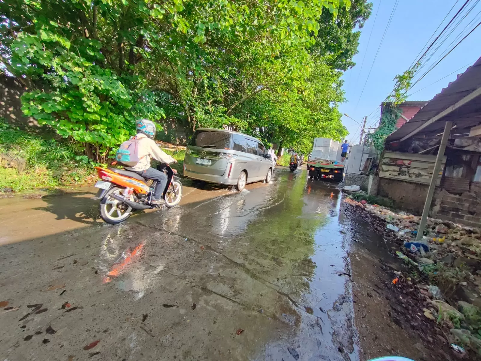 Genangan air juga membanjiri jalan lantaran drainase di sebelah kiri jalan mampet. Terdapat pula sampah yang terbawa air ke pinggir jalan.
