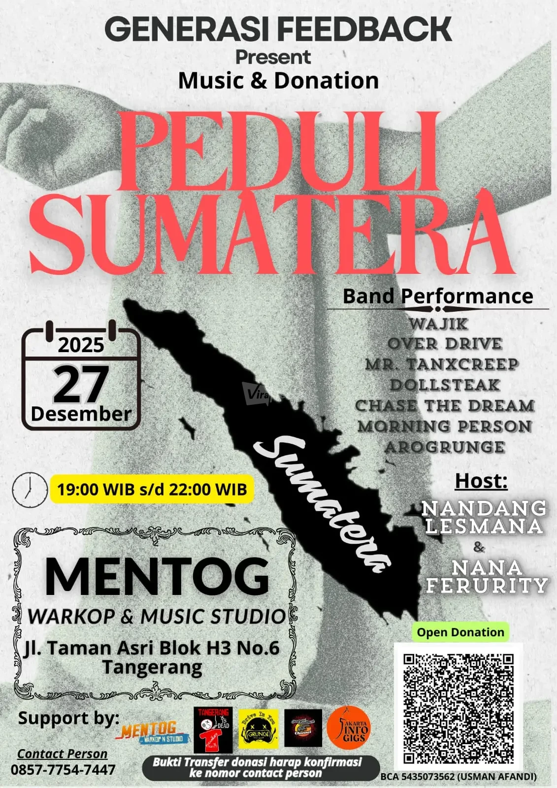 Viralterkini.id, Tangerang – Komunitas musik Generasi Feedback menggandeng tujuh band indie dalam kegiatan sosial dan kemanusiaan bertajuk Penggalangan Dana Peduli Bencana Alam di Sumatra, yang digelar di MENTOG Warkop dan Studio, Tangerang (27/12).