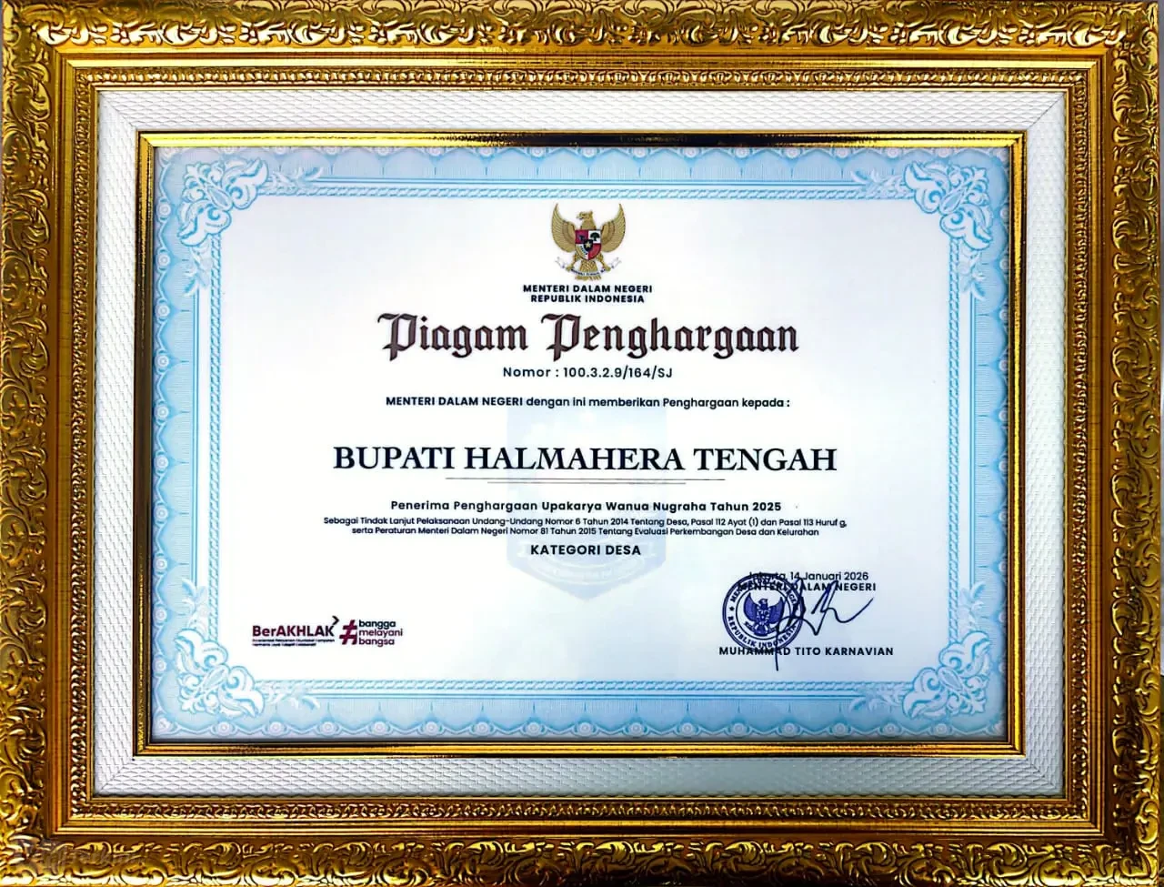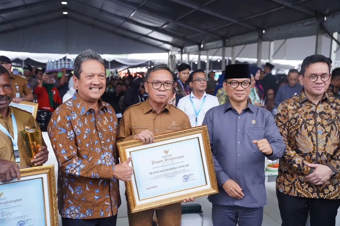 ​Kejutan dari timur tidak berhenti di sana. Pada momentum yang sama, Bupati Halmahera Tengah, Dr. Ir Ikram Malan Sangadji M.Si, turut naik ke podium kehormatan untuk menerima penghargaan Upakarya Wanua Nugraha dari Kementerian Dalam Negeri Republik Indonesia. Sebuah sapu bersih penghargaan yang mengukuhkan posisi Halmahera Tengah di peta prestasi nasional.