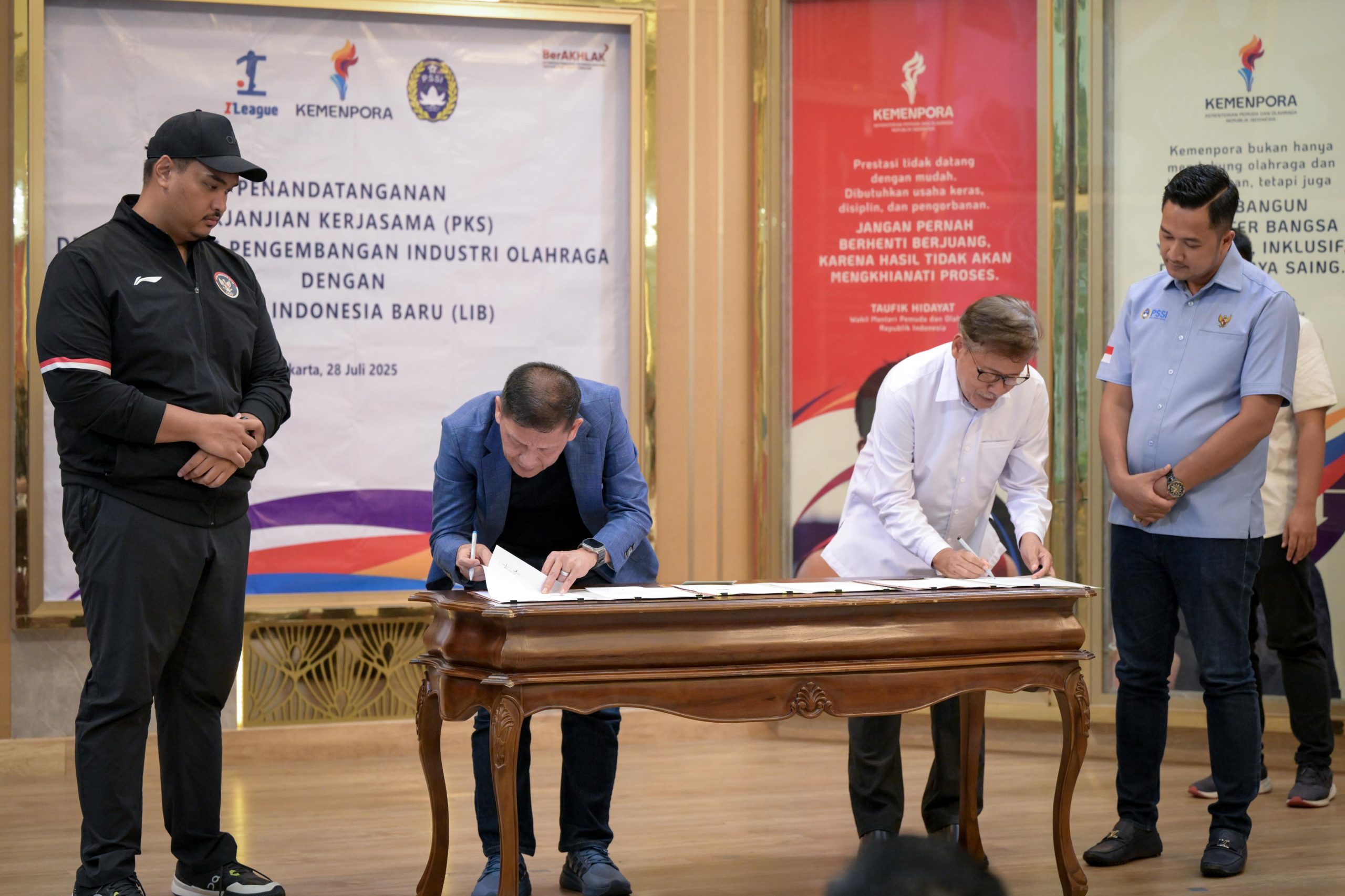Kerja sama ini ditandai dengan penandatanganan Perjanjian Kerja Sama (PKS) antara Deputi Bidang Pengembangan Industri Olahraga dan I.League dalam acara Kick Off Launching Kegiatan Komunikasi, Informasi, dan Edukasi (KIE) yang diselenggarakan pada Senin (28/7) di Gedung Graha Kemenpora, Jakarta. Foto : I.League Viralterkini.id, Jakarta – Dalam rangka mewujudkan pelaksanaan ketentuan Pasal 55 Undang-Undang Nomor 11 Tahun 2022 tentang Keolahragaan, Kementerian Pemuda dan Olahraga Republik Indonesia (Kemenpora) melalui Deputi Bidang Pengembangan Industri Olahraga secara resmi menjalin kerja sama dengan PT Liga Indonesia Baru (I.League).