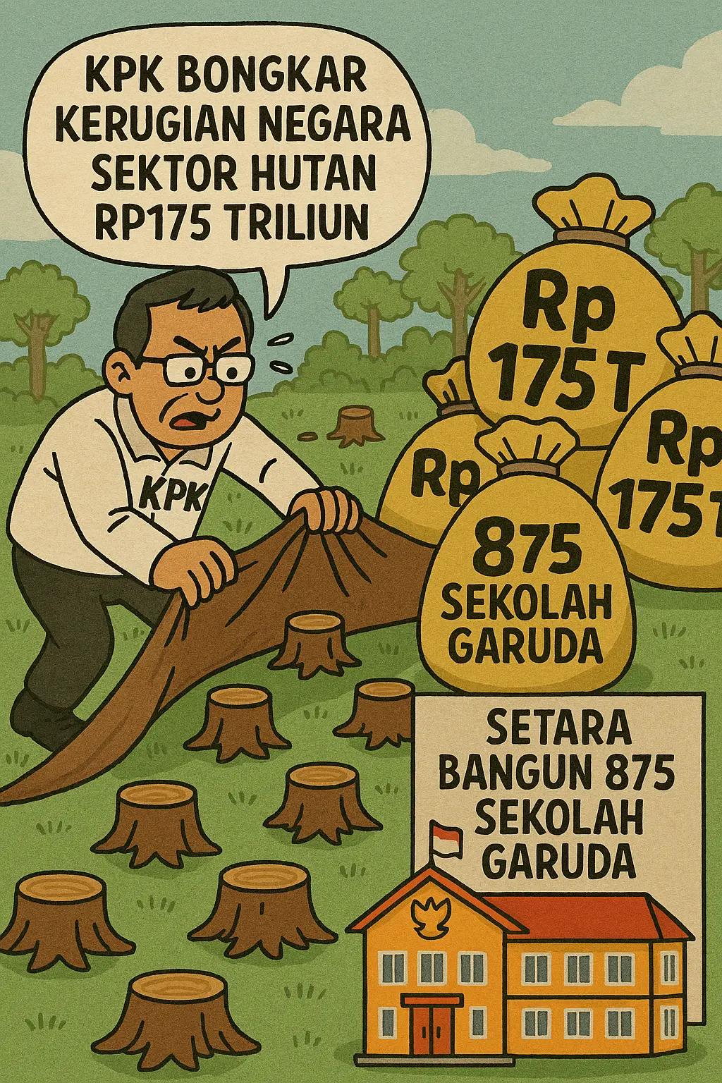 Karikatur Viralterkini.id Viralterkini.id – Komisi Pemberantasan Korupsi (KPK) mengungkap potensi kerugian negara dari sektor kehutanan yang menembus Rp175 triliun. Angka ini setara dengan biaya pembangunan 875 Sekolah Garuda, dengan estimasi Rp200 miliar per unit. Temuan tersebut sekaligus mempertegas alasan Presiden Prabowo Subianto memprioritaskan pemberantasan pelaku usaha yang merusak hutan.