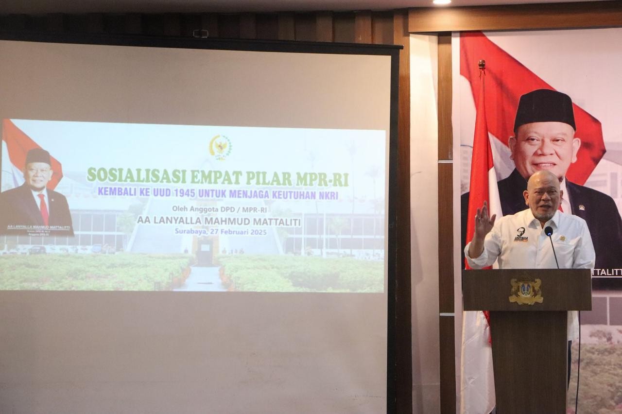 Hal ini disampaikan LaNyalla saat menjadi pembicara utama dalam Sosialisasi Empat Pilar MPR RI bertema “Kembali ke UUD 1945 untuk Menjaga Keutuhan NKRI” di Surabaya, Kamis (27/2). Acara tersebut dihadiri oleh Presiden Badan Eksekutif Mahasiswa (BEM) dari berbagai perguruan tinggi di Surabaya, seperti Unair, Unesa, UWKS, UIN Sunan Ampel, dan lainnya, serta sejumlah tokoh, termasuk Plt. Ketua Umum Kadin Jatim, Diar Kusuma Putra, dan Sekretaris MPW Pemuda Pancasila Jatim, M. Agus Diah Muslim.