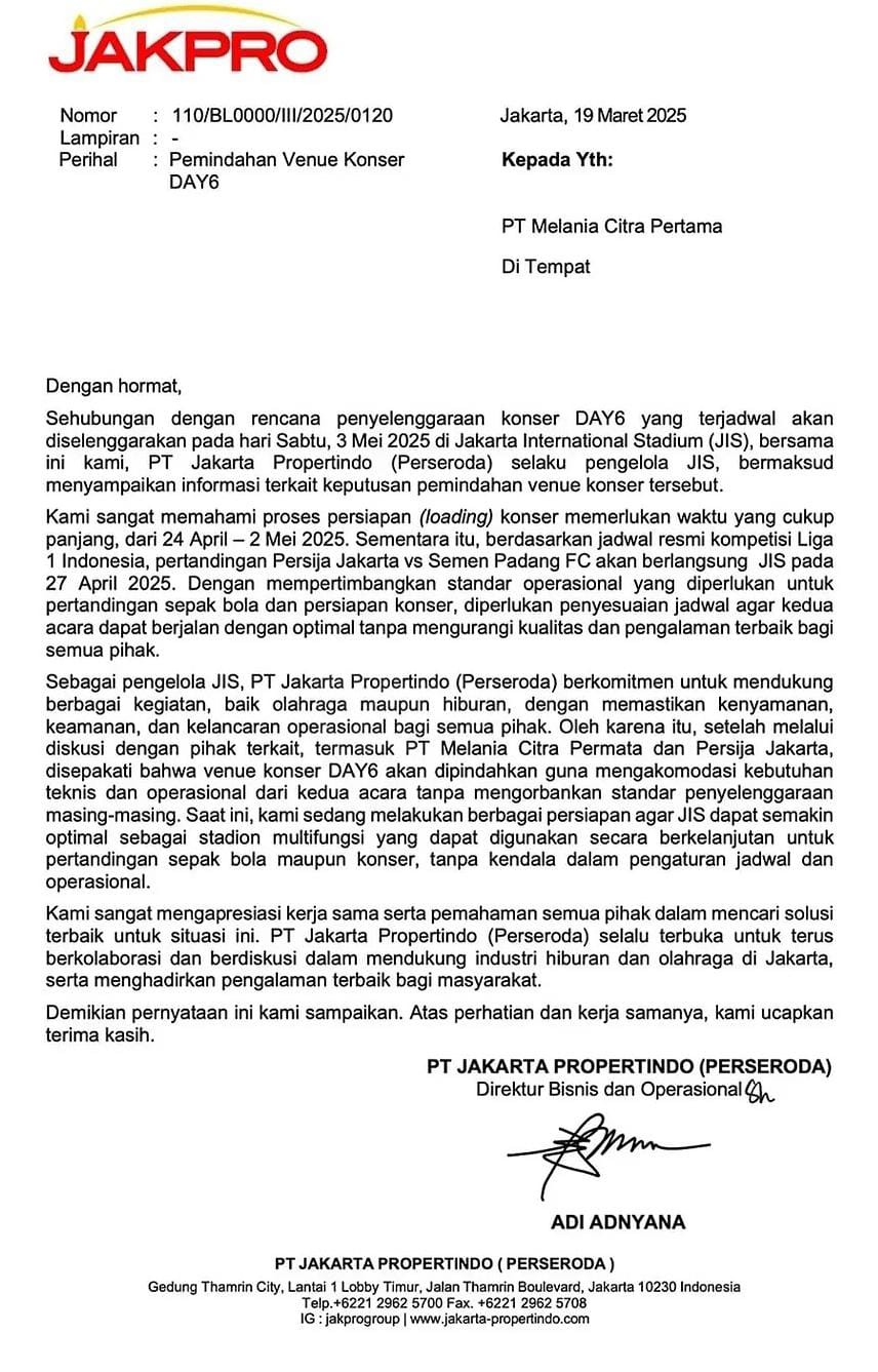 Sebagai bukti keseriusan, Mecima Pro turut melampirkan surat pernyataan resmi dari pengelola JIS, PT Jakarta Propertindo (Jakpro), yang membenarkan adanya penyesuaian jadwal demi kelancaran dua agenda besar tersebut.