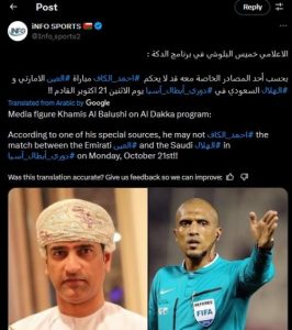 “Berdasarkan informasi dari salah satu sumber pribadinya, Ahmed Al Kaf tidak diizinkan memimpin pertandingan antara Al Ain dan Al Hilal di AFC Champions League Elite pada 21 Oktober 2024,” tulis Info Sports melalui akun X-nya, @Info_sports2.