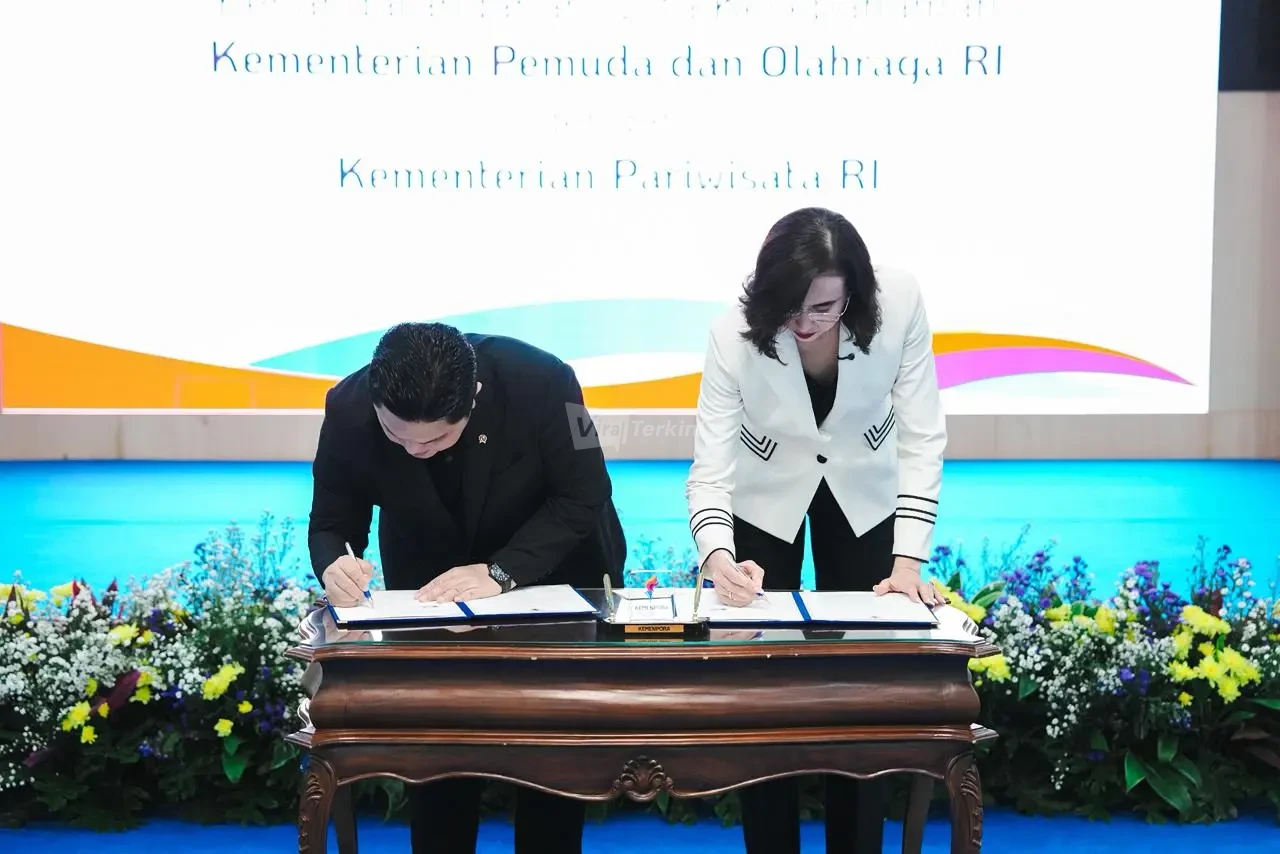 Menteri Pemuda dan Olahraga Republik Indonesia Erick Thohir saat menandatangani nota kesepahaman (MoU) dengan Menteri Pariwisata, Widiyanti Putri Wardhana di Auditorium Wisma Kemenpora, Senayan, Jakarta (22/12). Viralterkini.id, Jakarta — Menteri Pariwisata Widiyanti Putri Wardhana menyampaikan apresiasi tinggi kepada kontingen Indonesia atas pencapaian gemilang pada ajang SEA Games 2025 Thailand.