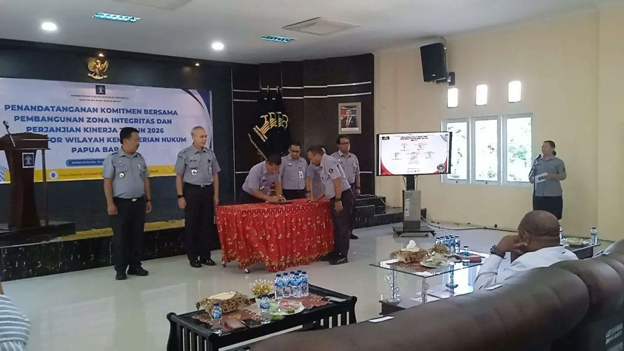 Viralterkini.id, Manokwari – Kantor Wilayah Kementerian Hukum (Kemenkum) Provinsi Papua Barat menegaskan komitmennya dalam membangun birokrasi yang bersih dan berintegritas melalui penandatanganan Komitmen Bersama Pembangunan Zona Integritas serta Perjanjian Kinerja Tahun 2026. Kegiatan tersebut digelar di Kantor Kanwil Kemenkum Papua Barat, Manokwari, Senin (19/1/2026).