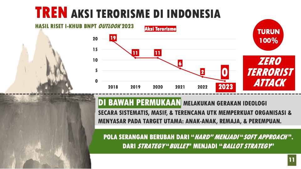 Merujuk pada hasil riset I-KHUB BNPT OUTLOOK 2023, bahwa pada tahun 2023 terjadi penurunan zero teroris attack dimana mereka melakukan gerakan ideologi secara sistematis dan terencana yang menargetkan perempuan, anak-anak dan remaja.