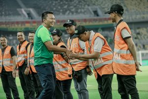 Bos Persebaya Surabaya, Azrul Ananda, para staf Bajul Ijo tampak menyalami para steward itu satu persatu. Foto : Media Persebaya