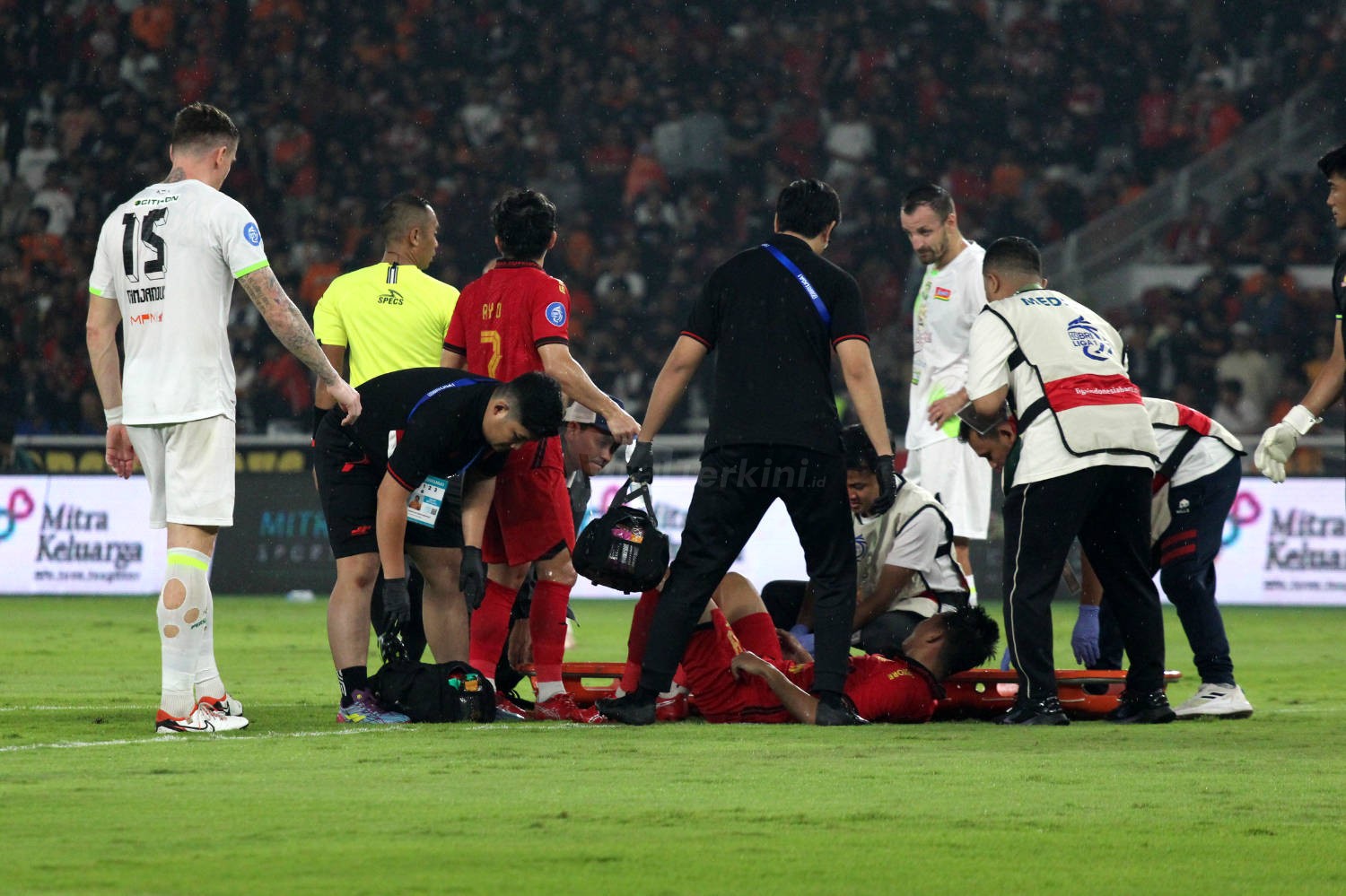 Pemain Persija, Witan Sulaiman mengalami cedera saat melawan Persebaya, Stadion GBK Senayan Jakarta, Sabtu (12/04). Foto : Viralterkini.id/M Ary K Viralterkini.id, Jakarta – Laga panas antara dua tim papan atas BRI Liga 1 2024/2025, Persija Jakarta kontra Persebaya Surabaya, berakhir imbang 1-1 dalam pertandingan yang digelar di Stadion Utama Gelora Bung Karno (GBK), Jakarta, Sabtu (12/4) malam.