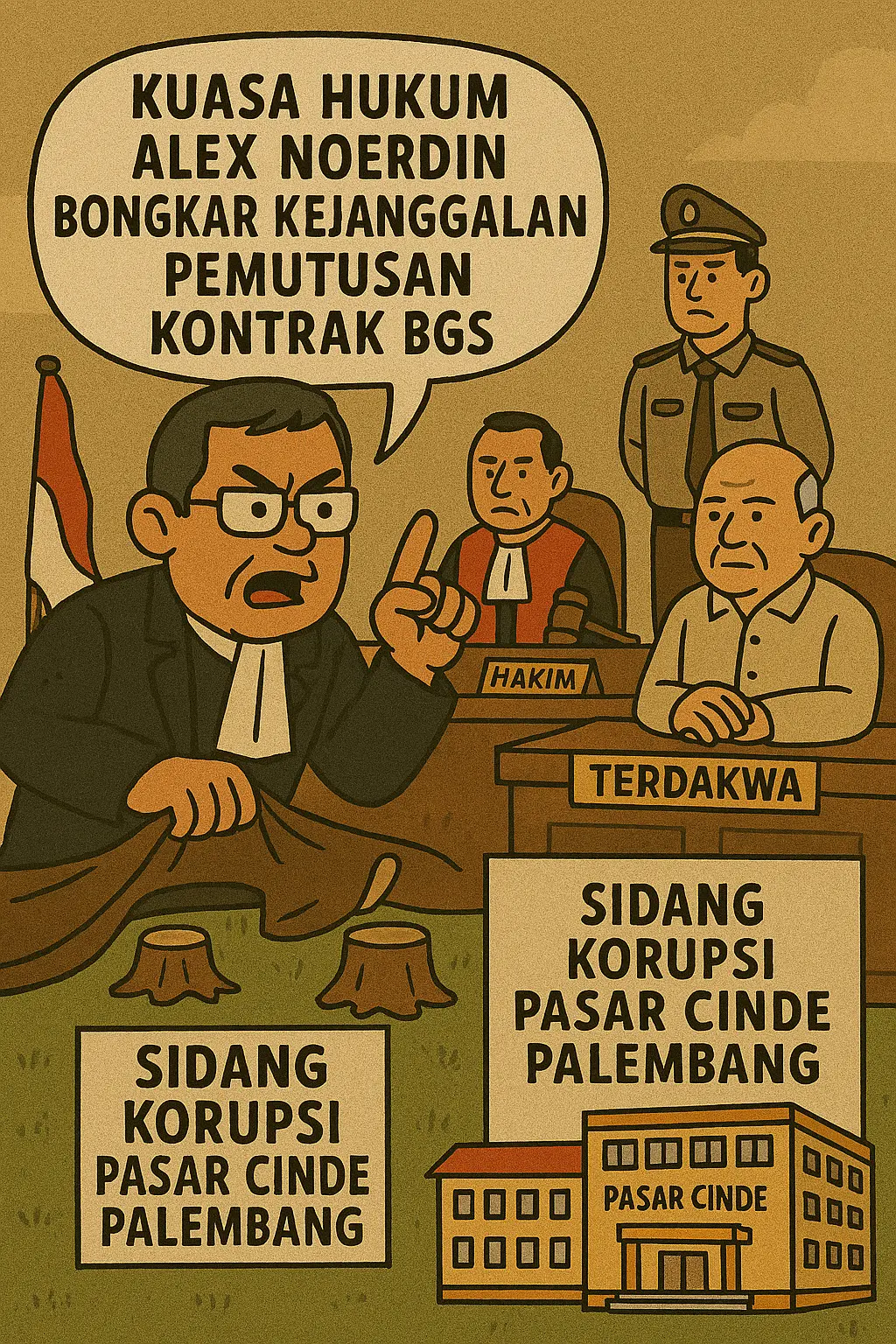 Karikatur Viralterkini.id Viralterkini.id – Pengadilan Negeri Tipikor Palembang kembali menggelar sidang lanjutan perkara dugaan korupsi pembangunan Pasar Cinde Palembang, Senin (12/1/2026). Perkara ini menyeret mantan Gubernur Sumatera Selatan H. Alex Noerdin bersama Eddy Hermanto sebagai terdakwa.