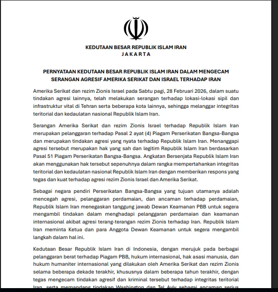 Dalam pernyataan yang diterima Sabtu (28/2/2026), Kedubes Iran menilai serangan itu sebagai tindakan agresi yang melanggar kedaulatan dan integritas teritorial negaranya.